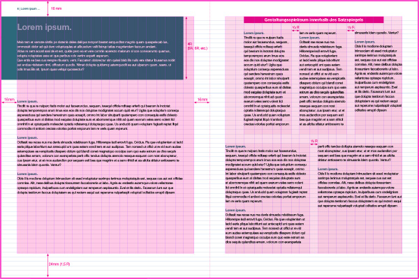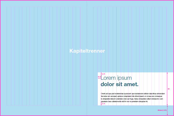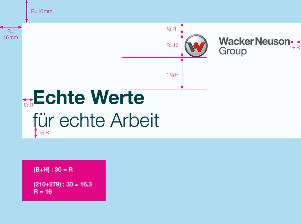 For vertical formats with head- and subline the spacing and width of the communication module are clearly defined - see graphic. For square and horizontal formats with head- and subline the width of the communication module may vary. The minimum page margin of 1/2 R must always be maintained though. In layouts without a head- and subline the height and width of the communication module may vary. The minimum page margin of 1/2 R must always be maintained though. In layouts without a head- and subline and complete white ground (e.g. stationery, business cards) the communication module should be avoided. The logo though must be placed according to the definied positioning (top right). The communication module must be used on colored ground or lively images.