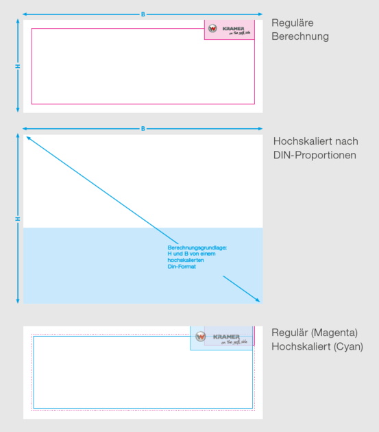 B and H for the calculation of type area and logo size are equivalent to the dimensions of a DIN format which is scaled to the width of the format.